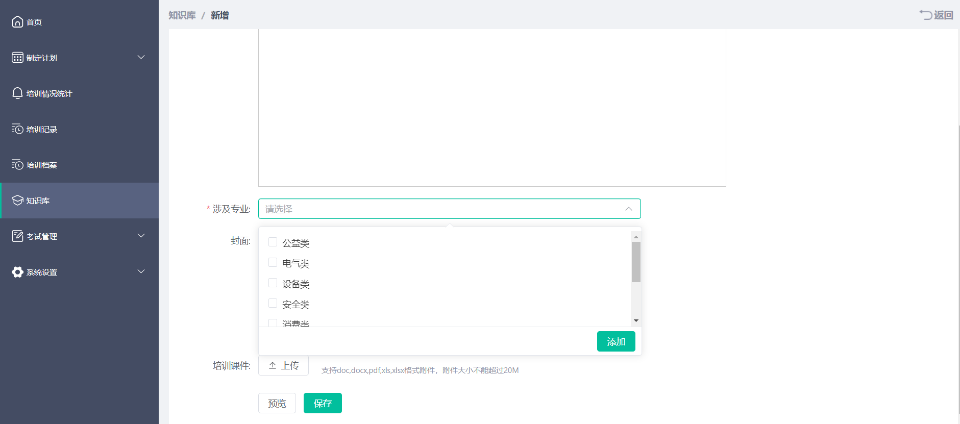 在海融易通企业安全风险智能化管控平台中,可根据不同的计划、主题、部门、岗位建立培训知识库,通过标题、内容、专业、课件等功能构建不同岗位的安全培训内容,满足系统建设应用指南要求。