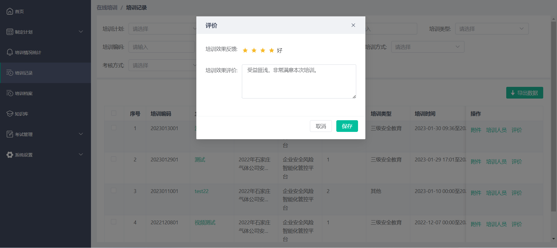 在海融易通企业安全风险智能化管控平台中,可通过培训记录栏目记录学员对培训效果的反馈和评价,也可以通过培训情况统计栏目对学员进行考核记录,实现培训效果的双向评价,满足系统建设应用指南要求。