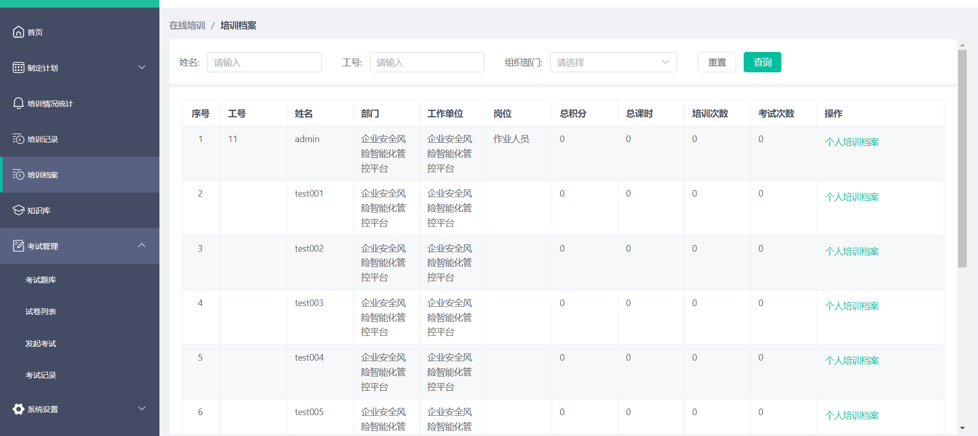 在海融易通企业安全风险智能化管控平台中,可在线查看员工培训列表,培训档案包括工号、姓名、单位、部门、岗位、性别、年龄、出生日期、学历、工龄、手机号码、培训主题、培训级别、培训类型、培训时间、培训老师、考核方式等详细信息,满足系统建设应用指南要求。