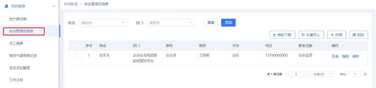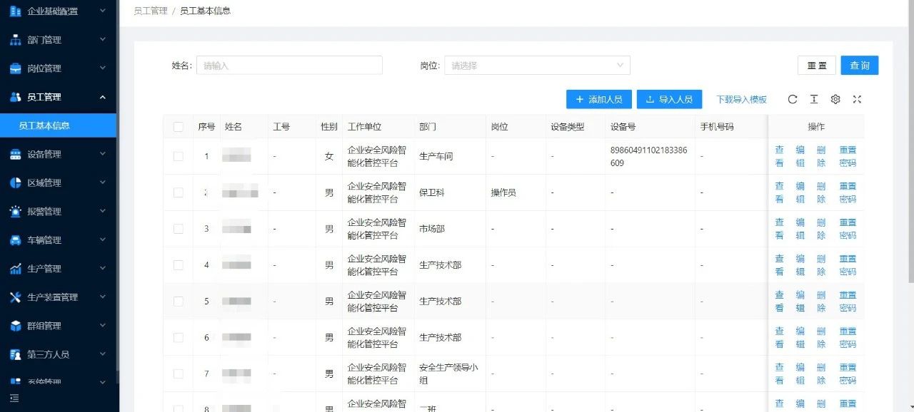 在海融易通企业安全风险智能化管控平台中,可对企业员工信息进行导入、添加、查看、编辑、删除等操作,查询和管理安全生产责任制核心职务/岗位、安全管理员、员工等的资格证书和培训记录,满足系统建设应用指南要求。