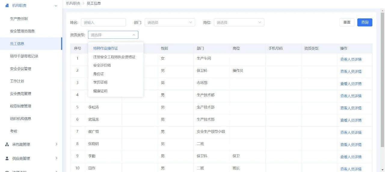 建设应用指南要求系统应具备人员资质分类管理功能,对企业人员资质进行精细化管理,保障人员资质合规化。