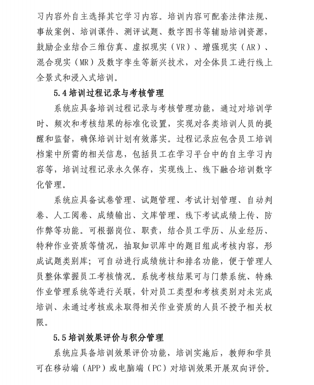 建设应用指南要求系统应具备培训过程记录与考核管理功能,通过对培训学时、频次和考核结果的标准化设置,实现对各类培训人员的提醒和监督,确保培训计划有效落实。