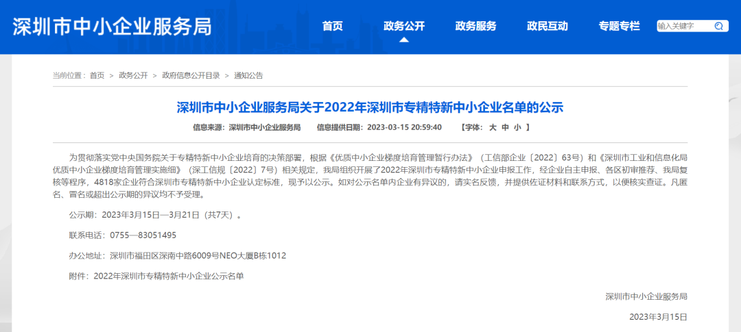 近日,深圳市中小企业服务局公布了2022年度深圳市“专精特新”中小企业名单,经企业申报、各区初审推荐、市中小企业服务局复核和公示,海融易通母公司善理通益符合深圳市专精特新中小企业认定标准,成功获得深圳市“专精特新”认定。