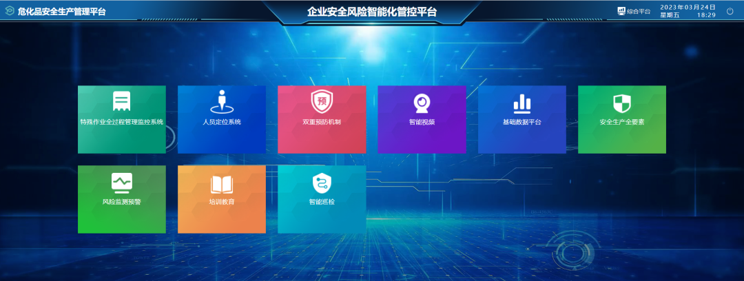 安全风险智能化管控平台按照工业互联网平台架构进行设计,建立统一的标准规范体系和安全运维保障体系,保证平台规范、安全、稳定运行。平台依托企业现有系统数据,通过接入企业实时监测、视频监控、人员定位、设备状态、特殊作业等数据,实现安全管理基础信息、重大危险源安全管理、双重预防机制、特殊作业许可与作业过程管理、智能巡检、人员定位等基础功能的信息化、数字化、网络化、智能化。