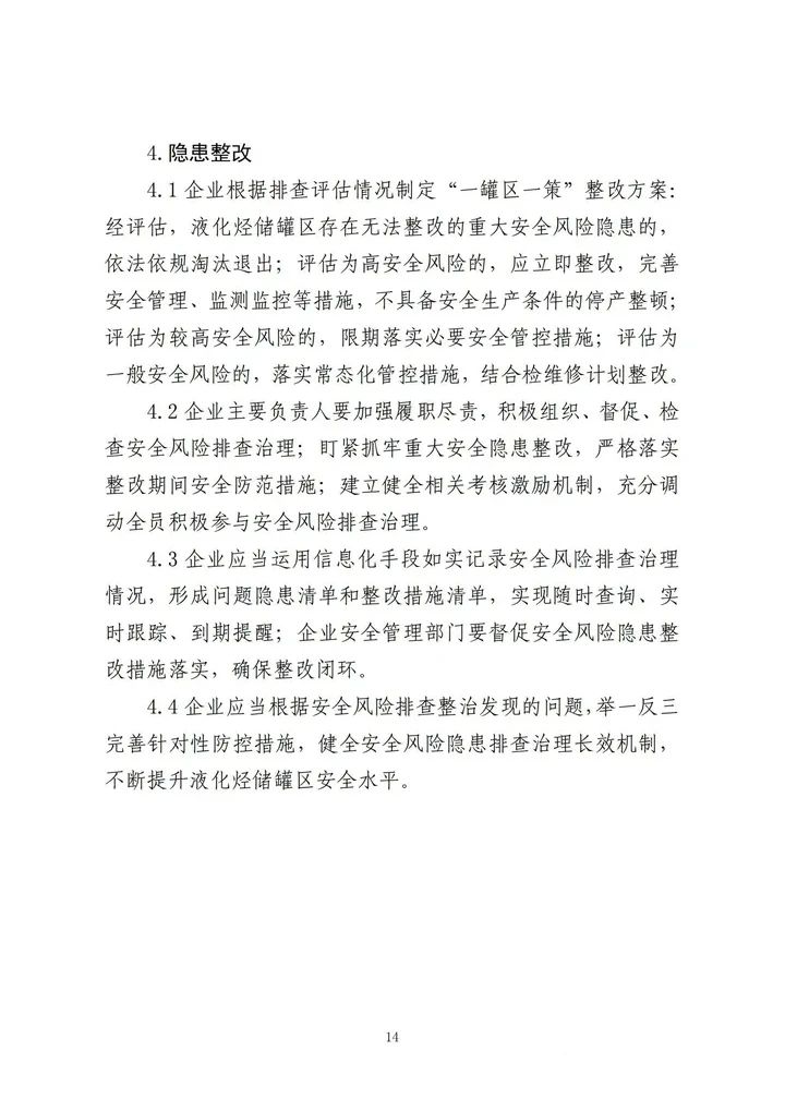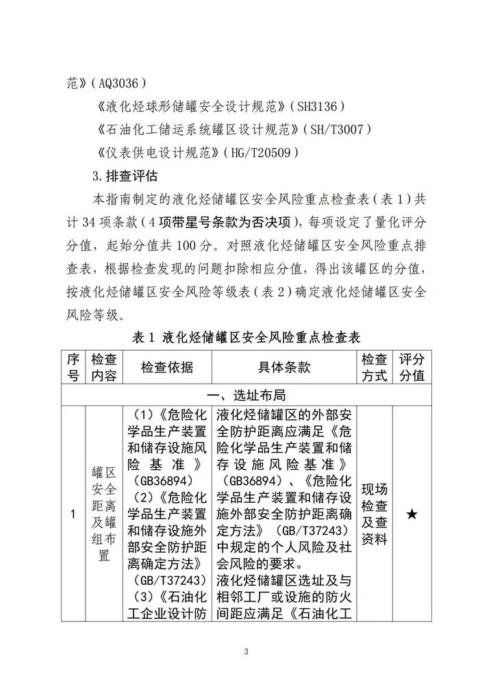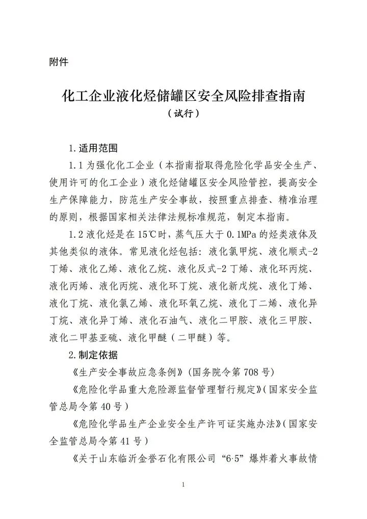 为落实2023年危险化学品安全生产重点工作部署,推动化工企业液化烃储罐区安全风险专项治理有效开展,近日,应急管理部危化监管一司组织编制了《化工企业液化烃储罐区安全风险排查指南(试行)》,要求按照《2023年度高危细分领域安全风险专项治理工作方案》,对照指南组织开展做好液化烃储罐区安全风险专项治理,有效防范化解重大安全风险。