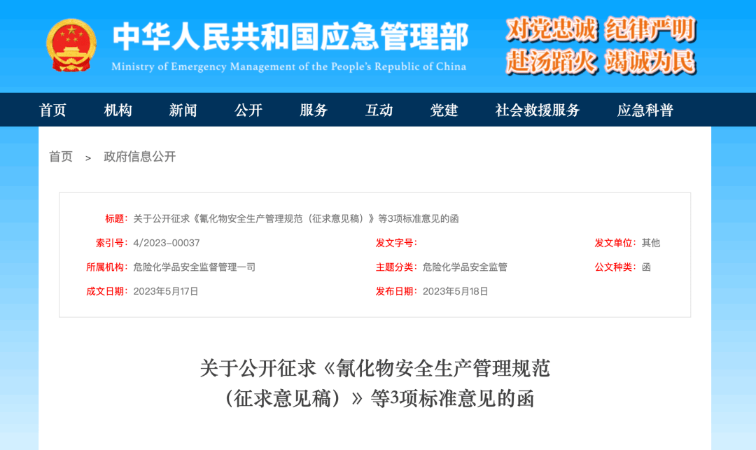近日,应急管理部发布关于公开征求《氰化物安全生产管理规范(征求意见稿)》等3项标准意见的函。